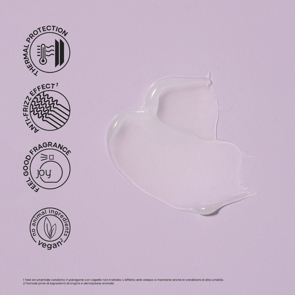 Это средство защищает волосы от повреждений, вызванных использованием горячих инструментов для укладки, и контролирует пушистость, облегчая укладку.